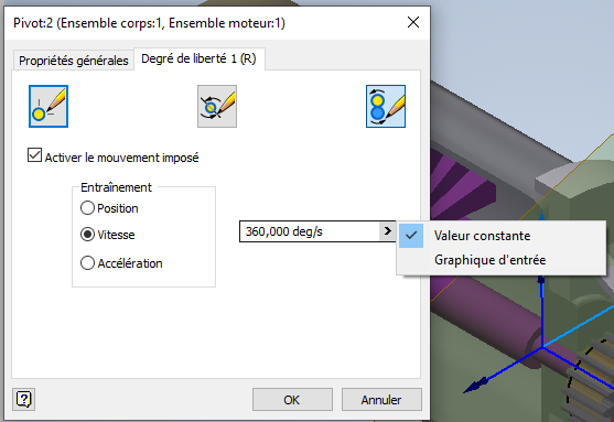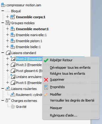 2. Mettre en mouvement la maquette - Dans l'arbre de construction (à gauche), cliquer avec le bouton de droite de la souris sur la liaison que vous voulez mettre en mouvement - Propriétés |