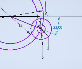 Etape 6 - tracer un trait à 22° passant par le centre du cercle puis utiliser les outils cercle et ajuster. Faire la symétrie comme précédemment. |