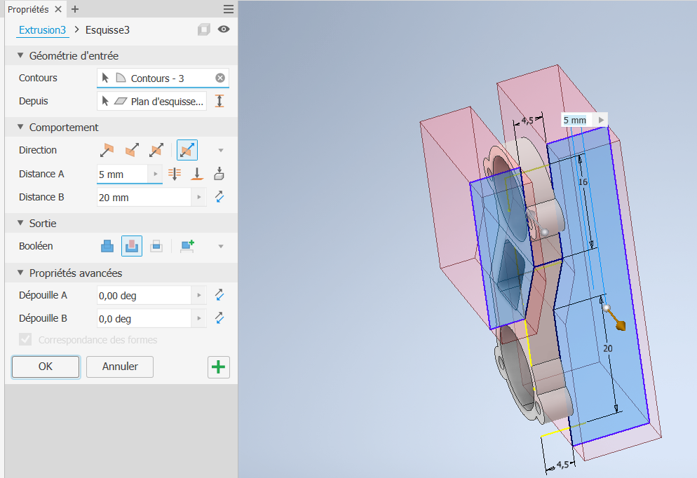 Attention à bien fermer vos contours. Cette fois-ci il s'agit de faire une extrusion en ôtant de la matière et non en en rajoutant.